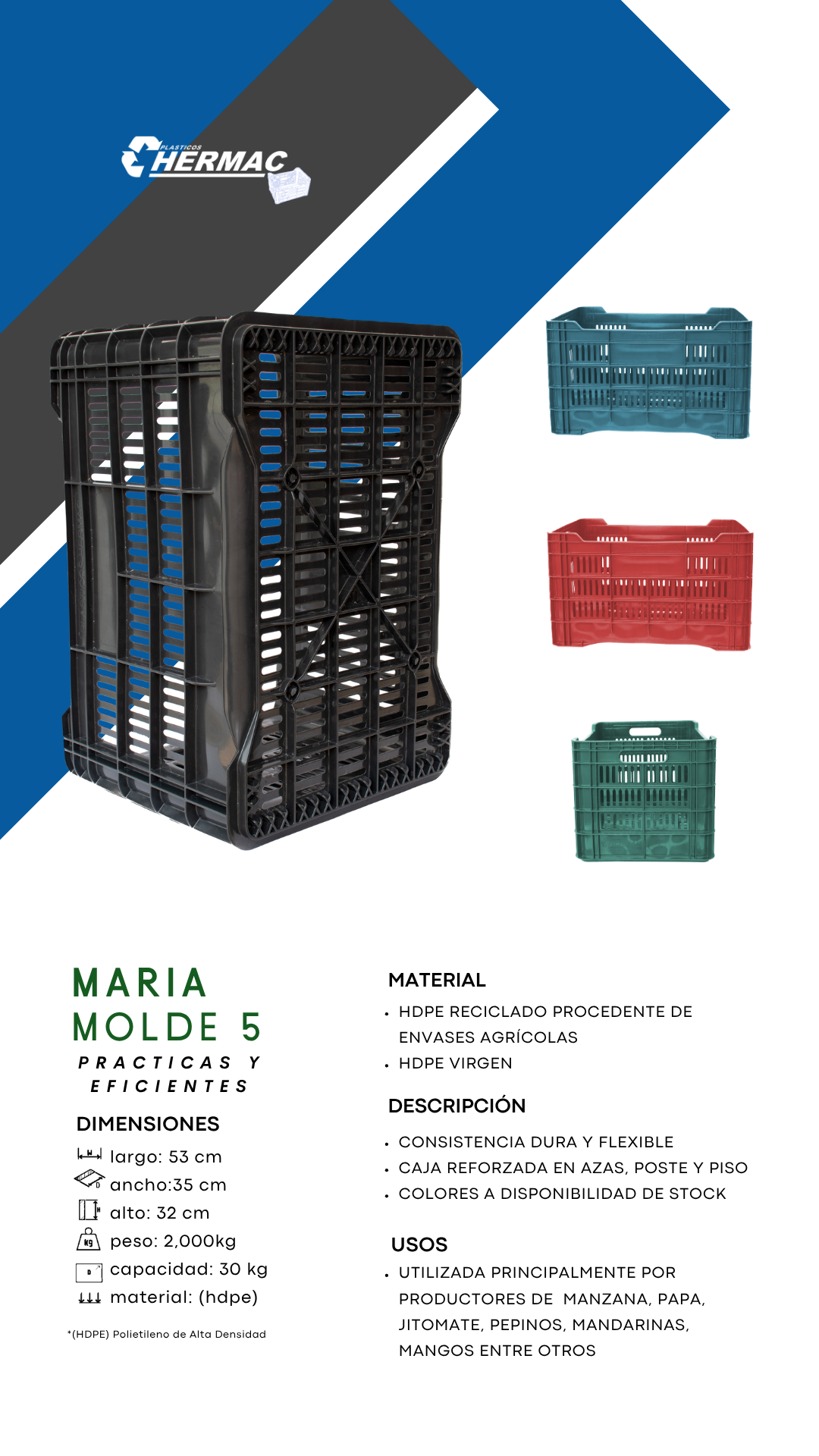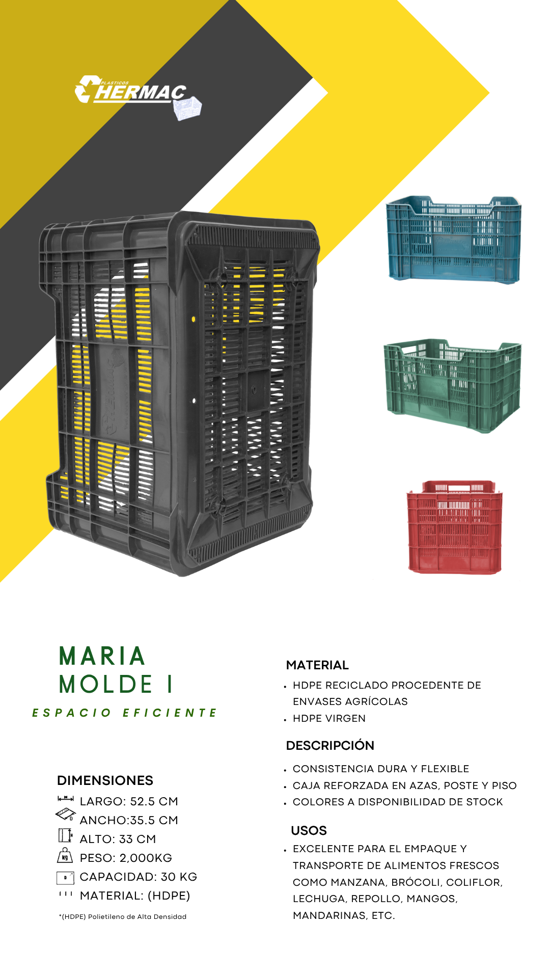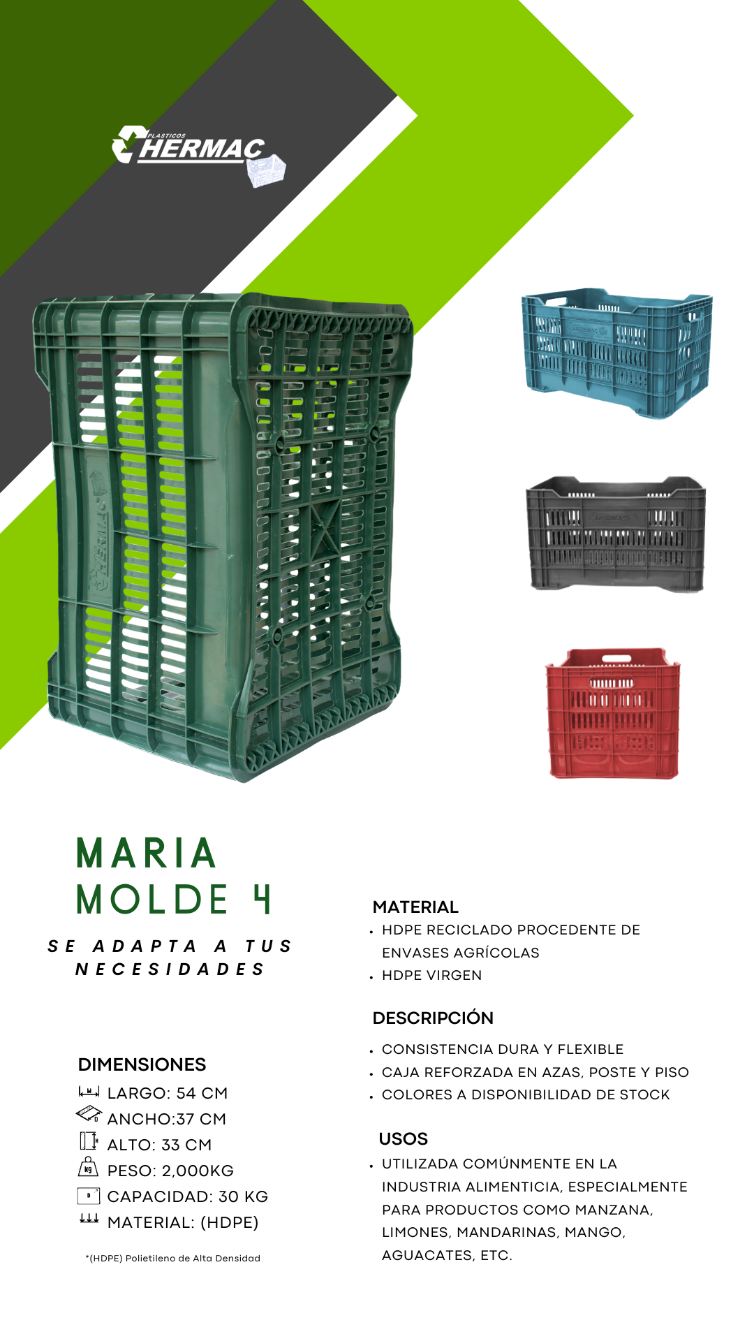 En Hermac, nos especializamos en la fabricación de cajas de plástico de alta calidad. Ofrecemos soluciones personalizadas y sostenibles diseñadas para satisfacer las necesidades de diversas industrias.